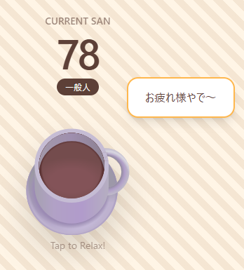 スマホアプリのようなUIで、タップしてSAN値を稼ぎましょう。設備を強化して、失ったSAN値を取り戻す?そんな癒やしの空間です。(※ブラウザを閉じてもデータが保存されるので、隙間時間にどうぞ!)
