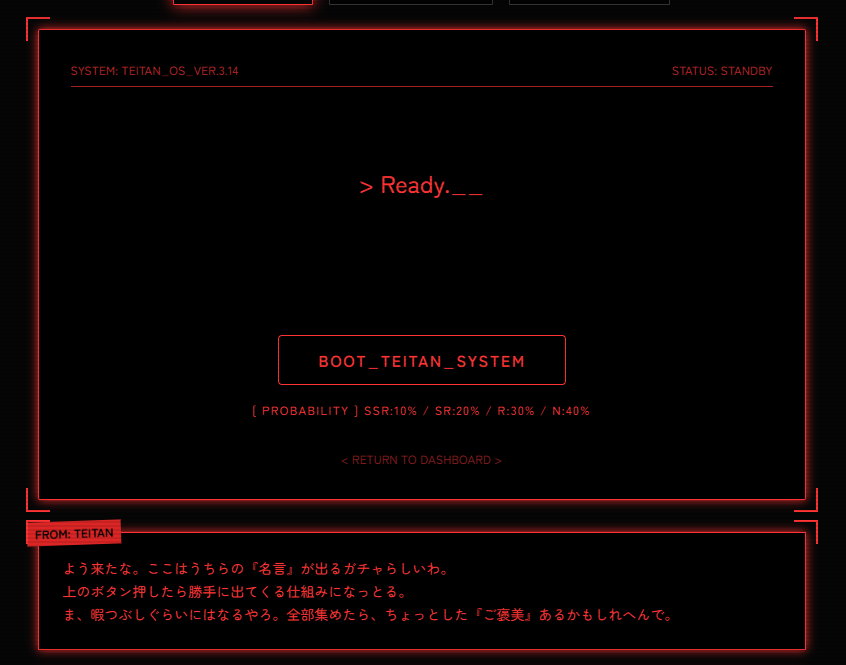 ハッカー端末風の画面で、彼女らの「名言(迷言?)」をランダムに出力します。モードによって画面の色が変わる演出にも注目してください。